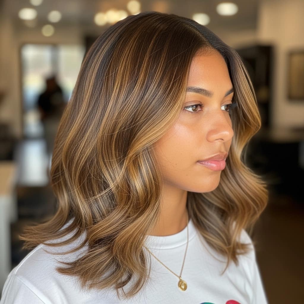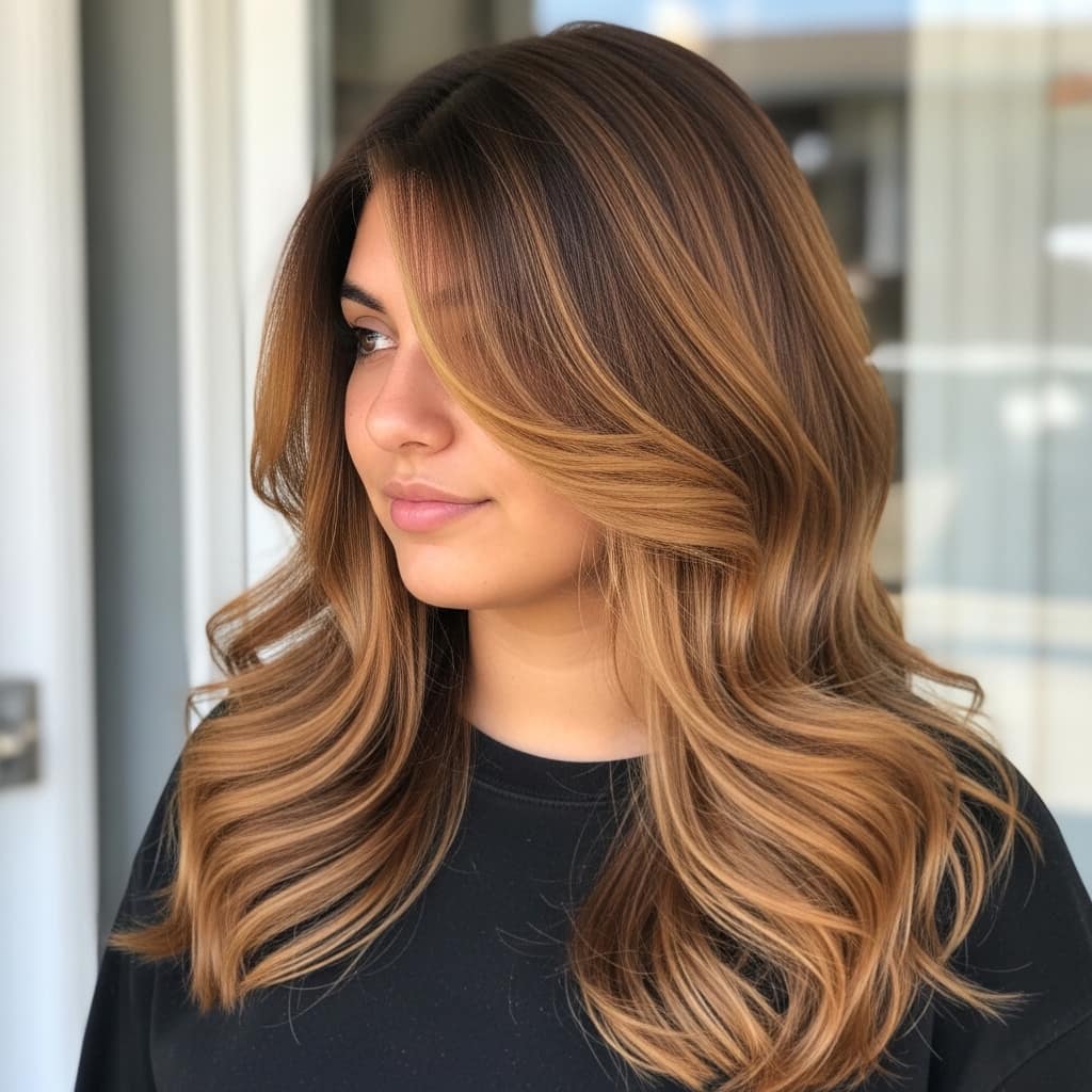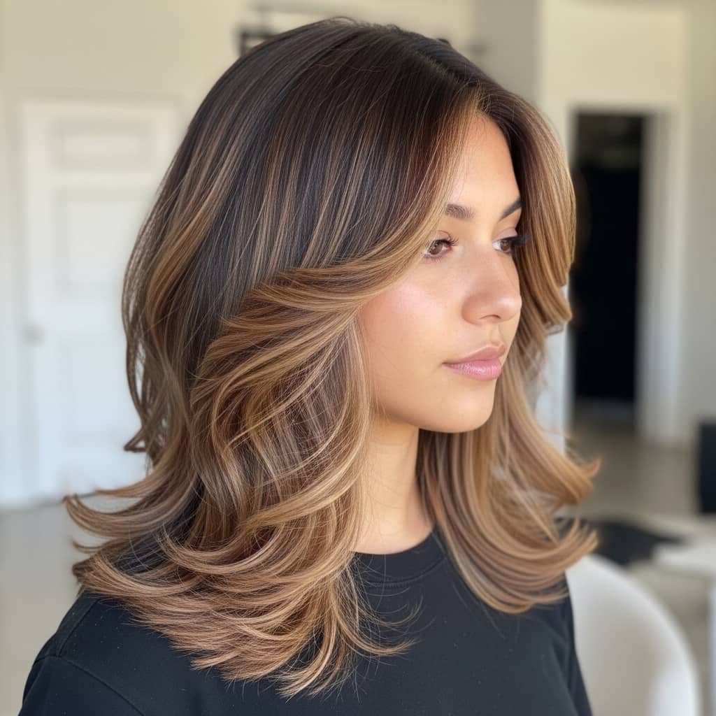 Caramel balayage instantly adds brightness while keeping your base color intact. The lighter strands catch sunlight, which creates a glowing, dimensional effect. Moreover, the soft transition keeps the look natural instead of harsh. I’ve noticed that this style works especially well for long layered hair because it enhances movement. The warm tones also add a youthful touch. Therefore, this technique remains one of the most popular options for adding lightness without committing to full color changes.