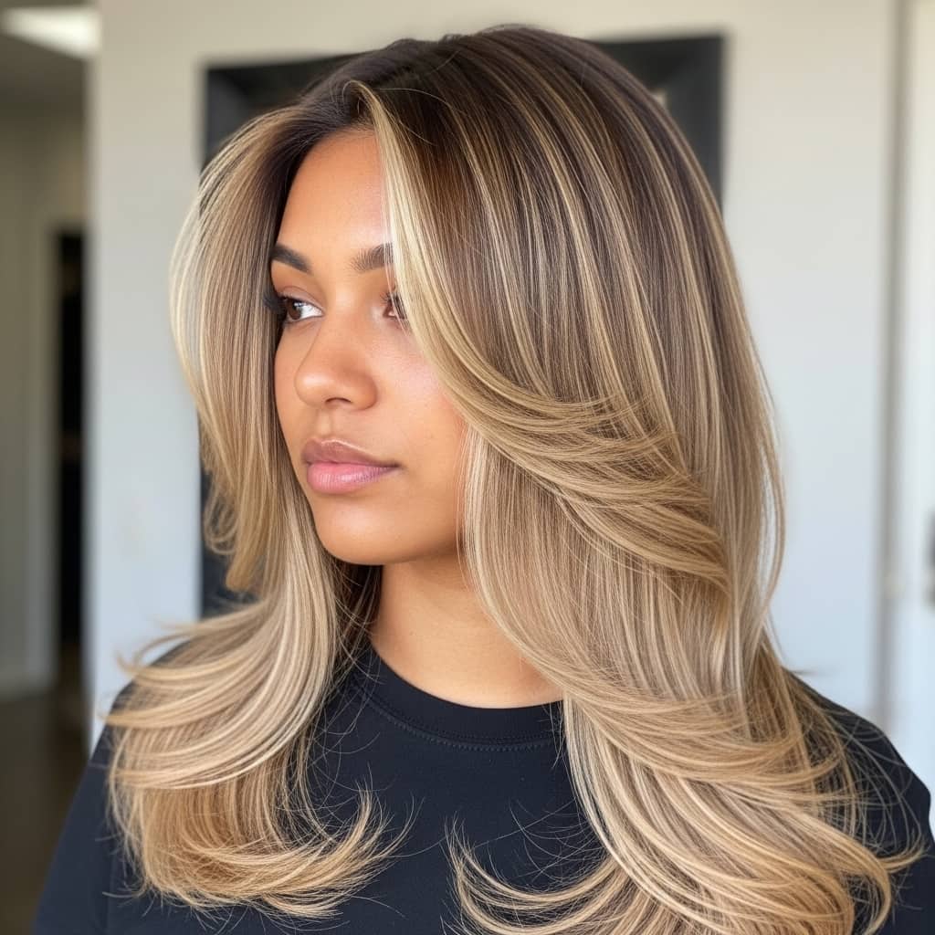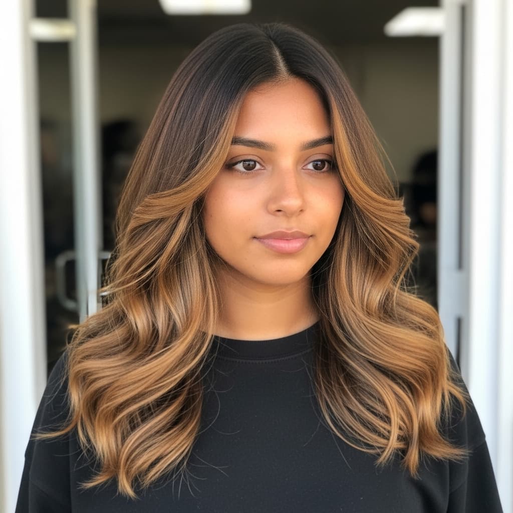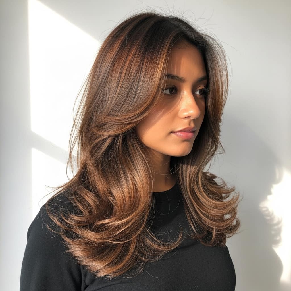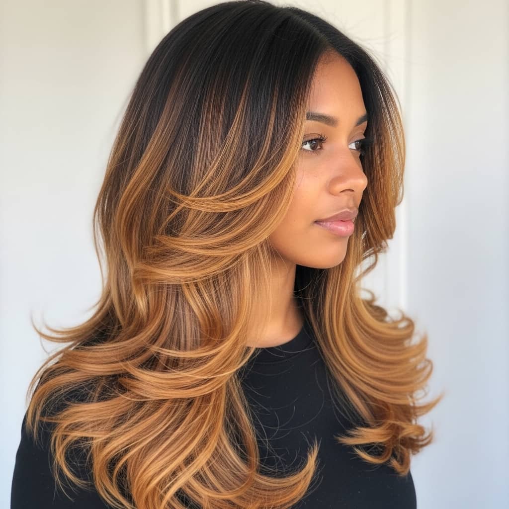 Caramel balayage instantly adds brightness while keeping your base color intact. The lighter strands catch sunlight, which creates a glowing, dimensional effect. Moreover, the soft transition keeps the look natural instead of harsh. I’ve noticed that this style works especially well for long layered hair because it enhances movement. The warm tones also add a youthful touch. Therefore, this technique remains one of the most popular options for adding lightness without committing to full color changes.