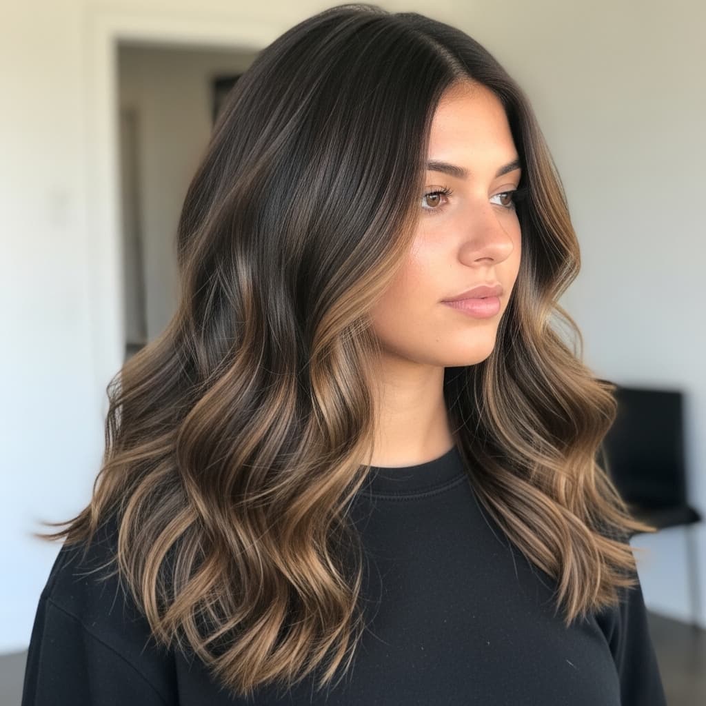 Toffee balayage adds a warm, golden touch that instantly brightens brunette hair. The lighter tones reflect sunlight, which creates a soft glow and natural dimension. Moreover, the gradual blend keeps the look polished and wearable. I’ve noticed that this style works especially well for long layers. The warmth enhances movement beautifully. Therefore, this balayage option remains a top choice for a glowing, modern look.