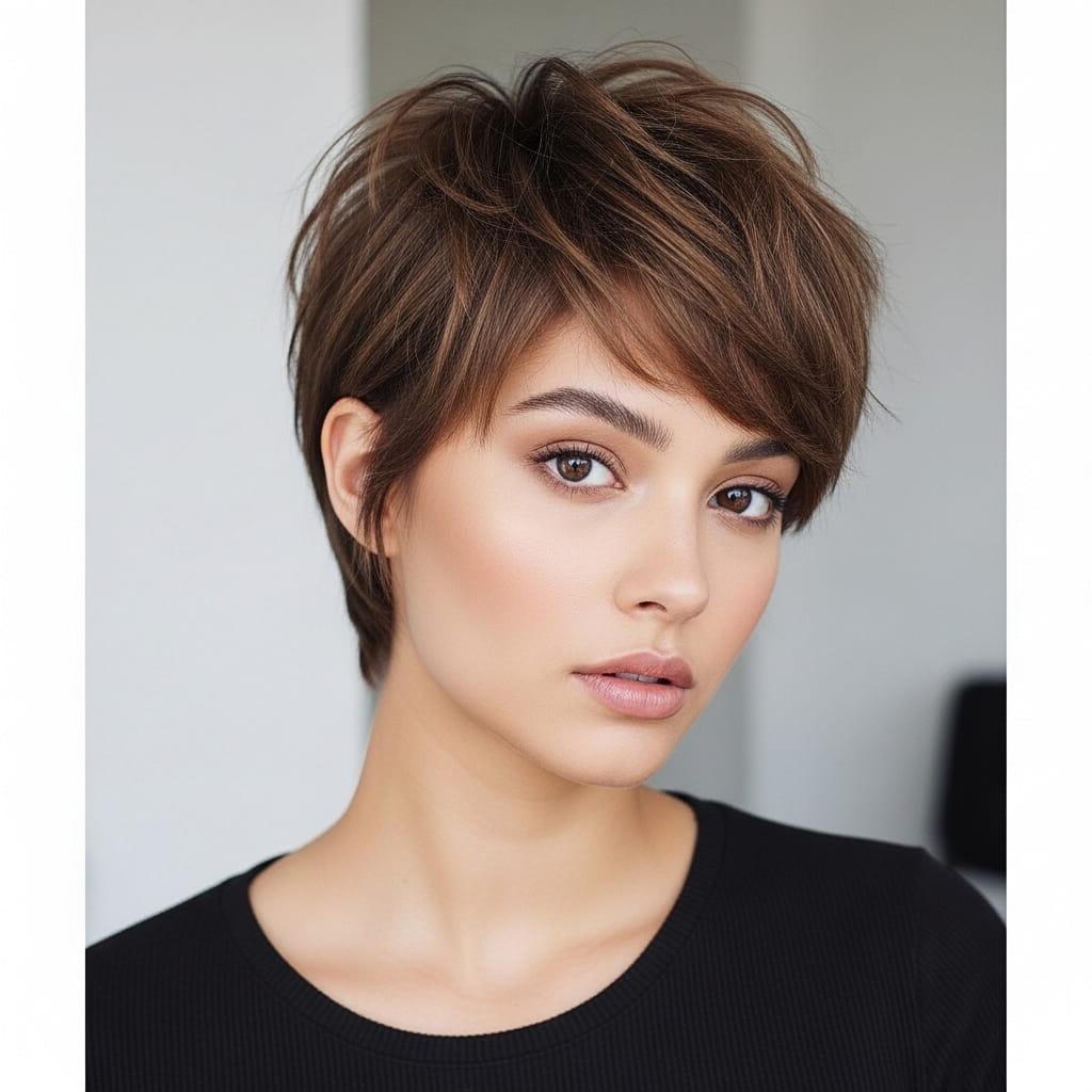 Choppy pixies bring energy and structure that keep your look fresh and stylish. This haircut adapts easily to different styling preferences. In my experience, a texturizing product enhances the layers without stiffness. Furthermore, the short length reduces styling time. That convenience makes it ideal for busy routines. Therefore, if you want a hairstyle that feels bold, flattering, and easy to maintain, this choppy pixie cut delivers a confident and trendy finish.