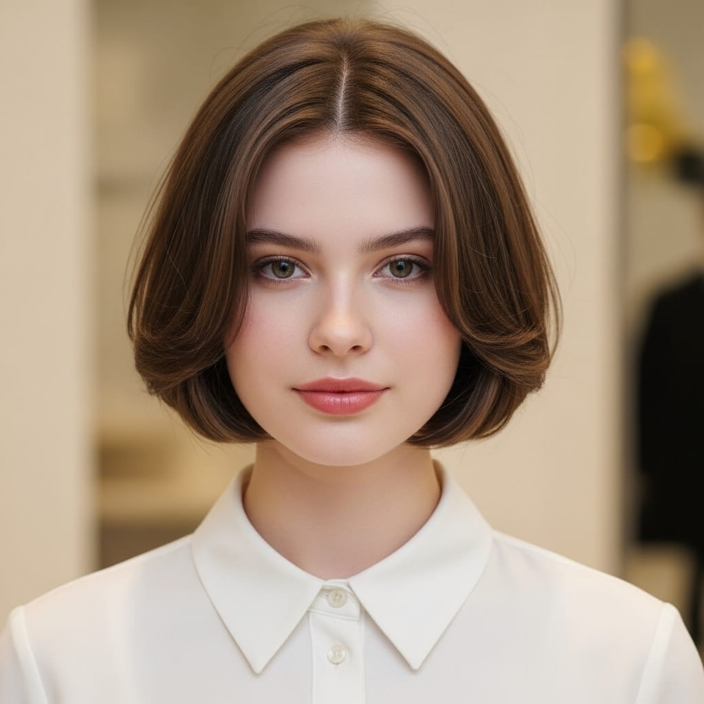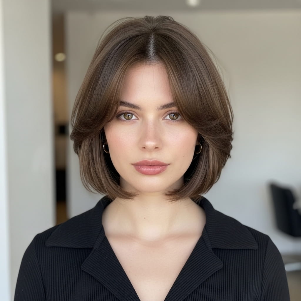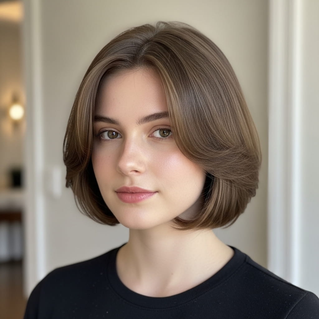 A rounded layered bob creates a smooth shape that softly frames the face without adding bulk. The curved structure balances fuller cheeks, while the light layers prevent heaviness. Moreover, the rounded edges give a gentle and polished finish. I’ve noticed that this style works especially well for everyday elegance. The softness enhances natural features without sharp lines. Therefore, this haircut offers a flattering option that blends structure and comfort beautifully for a refined look.