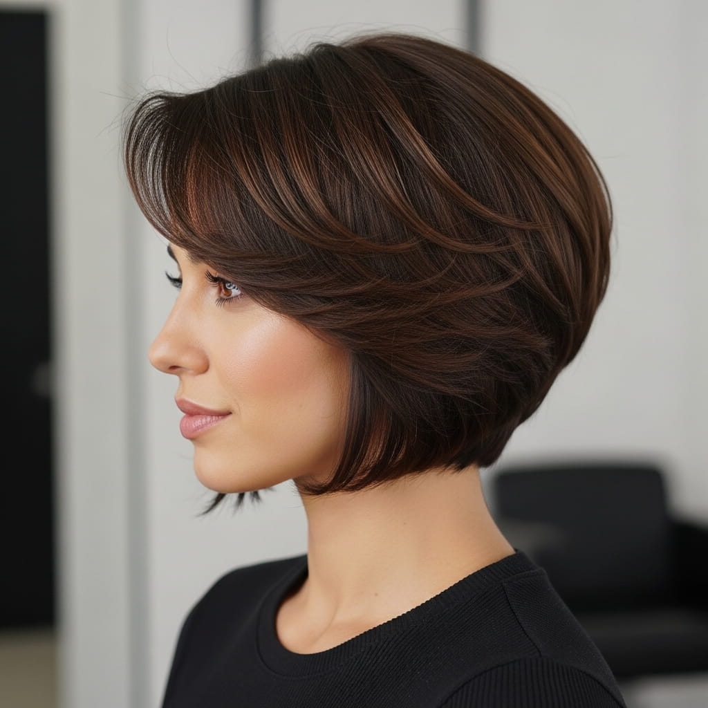 Graduated cuts bring a defined silhouette that stays stylish throughout the day. This hairstyle adapts well to both casual and professional looks. In my experience, a blow dryer with a round brush enhances the stacked layers quickly. Additionally, the shape holds well with minimal effort. That durability makes it practical. Therefore, if you want a hairstyle that feels structured, modern, and flattering, this graduated bob cut delivers a refined and confident finish.