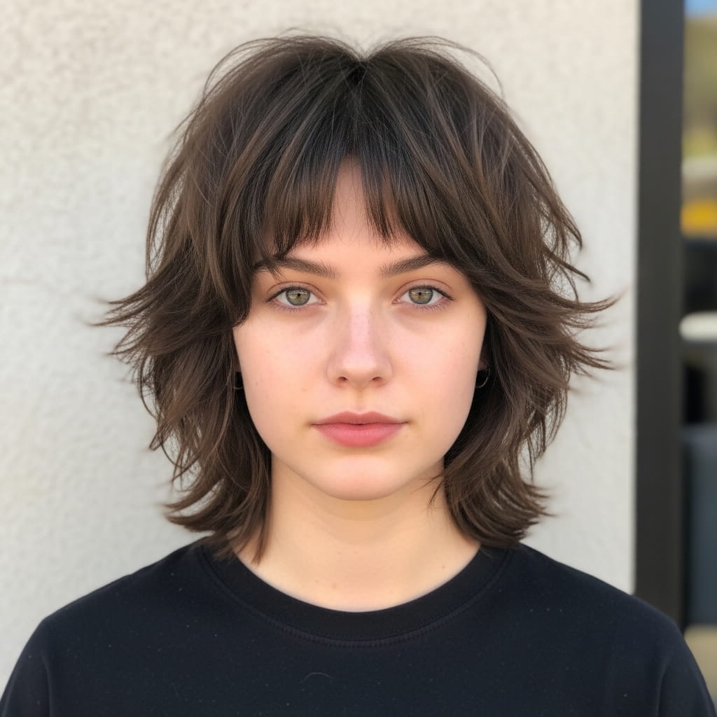 A short shag adds texture and movement that reduces the appearance of facial fullness. The choppy layers break up volume, which prevents the face from looking wider. Moreover, the soft fringe adds balance around the forehead. I’ve seen this style work beautifully for many people who want a relaxed, trendy look. The texture keeps the hairstyle lively. Therefore, this cut offers a modern and flattering option for effortless styling.