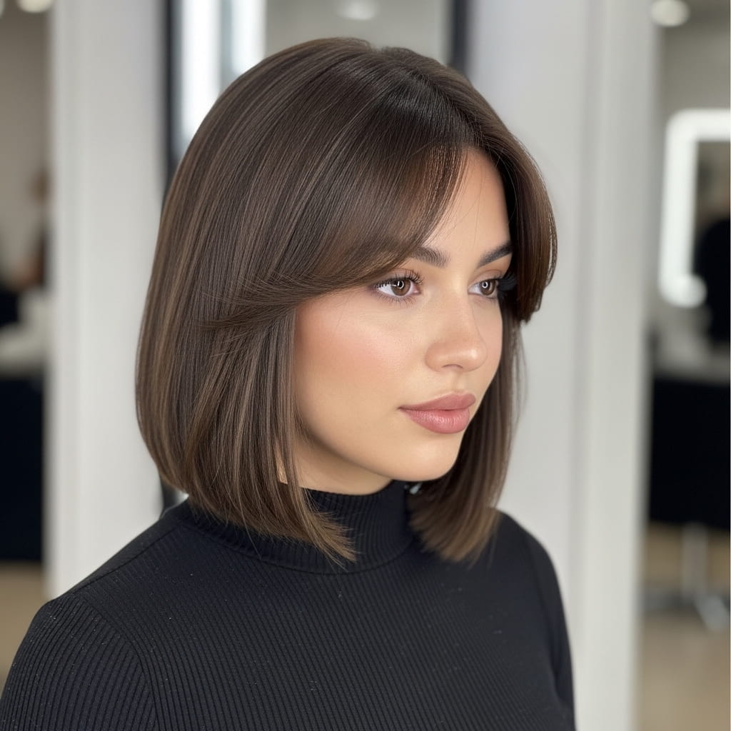 A side fringe bob creates a diagonal flow that softens facial fullness naturally. The side fringe draws attention across the face, which helps elongate its appearance. Moreover, the smooth bob keeps the style clean and polished. I’ve noticed that this look works especially well for both casual and formal settings. The soft fringe adds movement without overwhelming the face. Therefore, this haircut offers a flattering and versatile option.