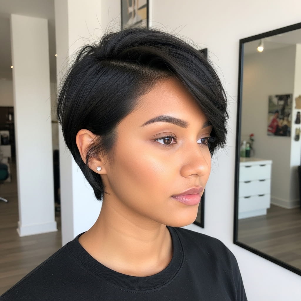 A side part pixie creates a diagonal line that instantly slims the face visually. The deep part adds volume at the crown, which elongates facial proportions. Moreover, the soft layers keep the style from looking too harsh. I’ve noticed that this haircut works especially well for quick styling routines. The structure remains polished all day. Therefore, this pixie variation offers a flattering and practical option for everyday elegance.