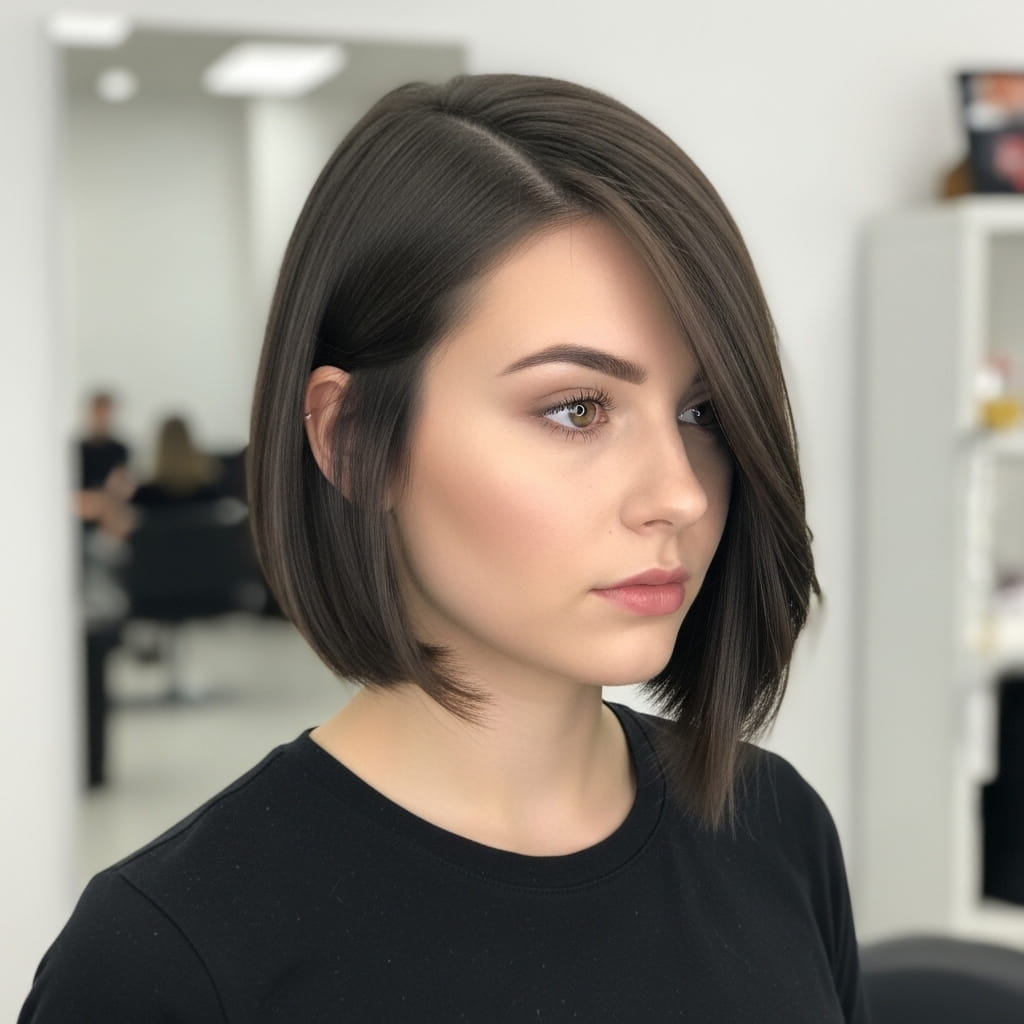 A side swept bob instantly creates asymmetry, which helps slim the appearance of fuller cheeks. The deep side part draws attention diagonally, making the face look longer and more defined. Moreover, the smooth finish keeps the style polished and elegant. I’ve seen this style work beautifully for many people who want structure without losing softness. The clean edges also enhance jawline definition. Therefore, this haircut remains a reliable option for creating a refined and flattering everyday look.