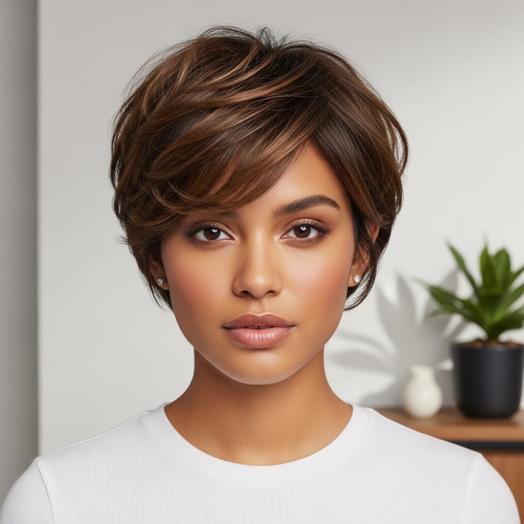 A soft layered pixie instantly creates a lifted and balanced look that flatters fuller cheeks beautifully. The feathered layers add height at the crown, which visually elongates the face. Moreover, the soft texture prevents the haircut from looking too sharp or harsh. I’ve noticed that this style works especially well for everyday wear because it feels light and manageable. The subtle layering also enhances movement naturally. Therefore, this option stands out among short haircuts for chubby faces because it shapes the face while keeping the overall look elegant and modern.