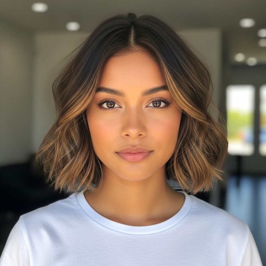Soft waves add movement that naturally reduces the appearance of facial fullness. The gentle texture breaks up the width around the cheeks, which creates a more balanced look. Moreover, the waves add softness that feels effortless and stylish. I’ve seen this style work beautifully for many people who want a relaxed everyday look. The subtle highlights also enhance dimension. Therefore, this bob offers a flattering and modern option.