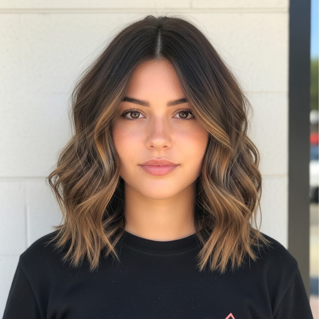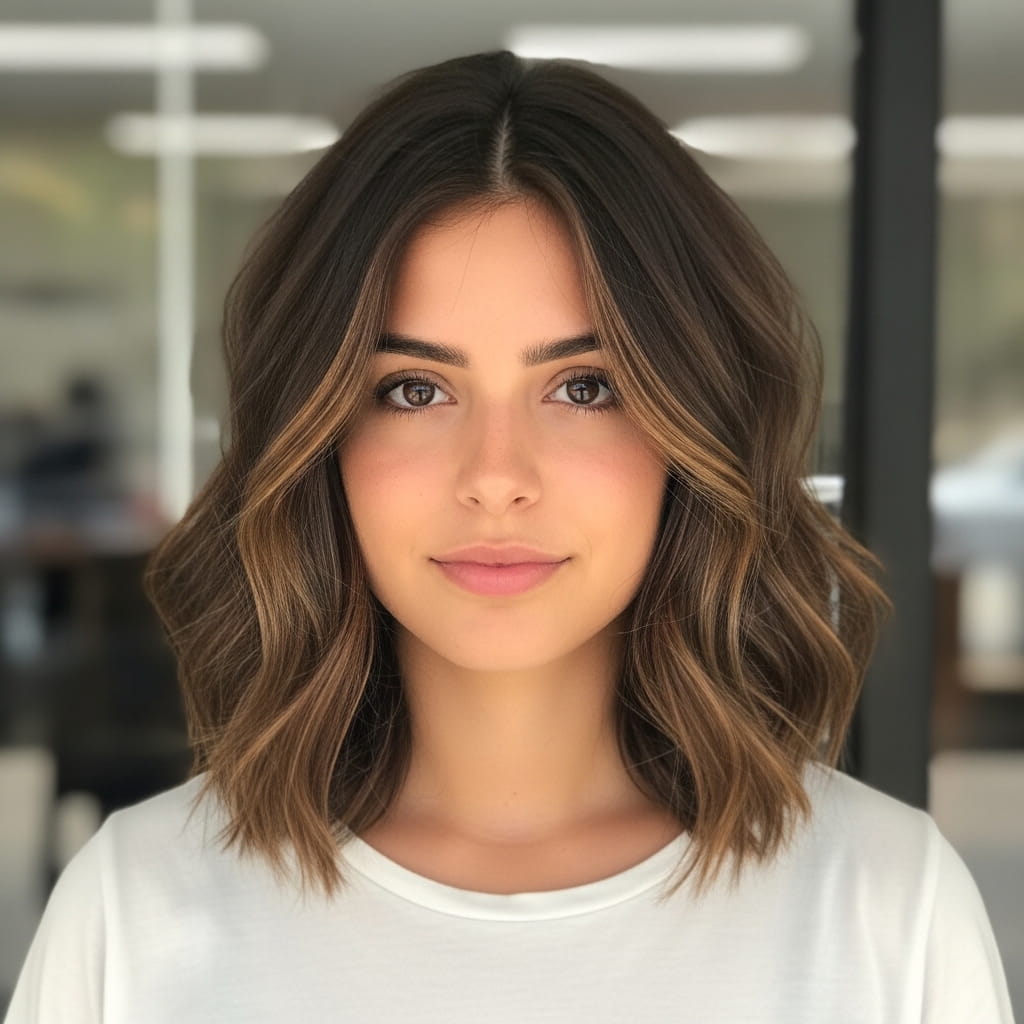 A wavy layered lob creates movement that softens facial fullness naturally. The layers add dimension, while the waves break up width around the cheeks. Moreover, the medium length adds vertical balance. I’ve seen this style work beautifully for many people who want a versatile everyday look. The texture enhances volume without heaviness. Therefore, this haircut offers a flattering and adaptable option for modern styling.